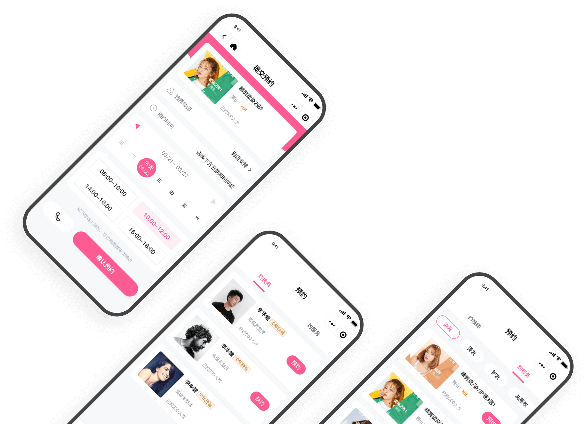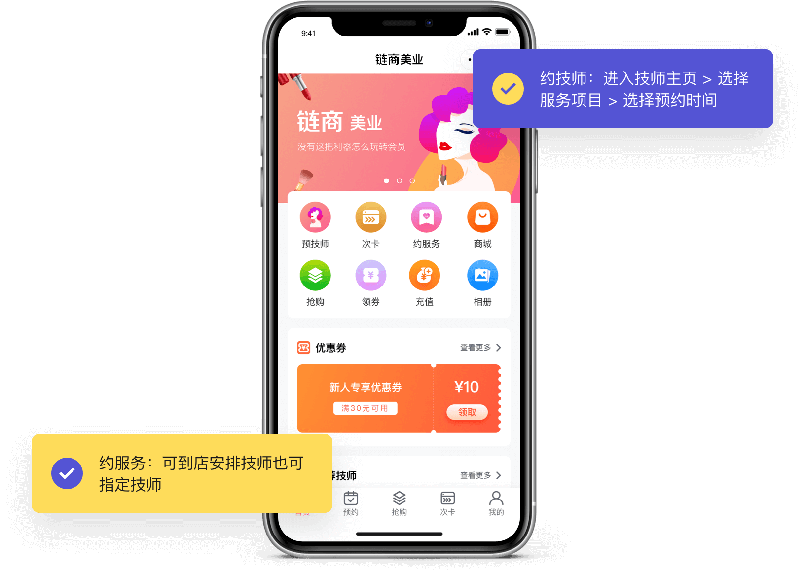 灵活的在线预约,约技师和约服务,办次卡,购买服务,完善的小程序店铺,技师主页、绝佳的体验,坐拥微信10亿流量。