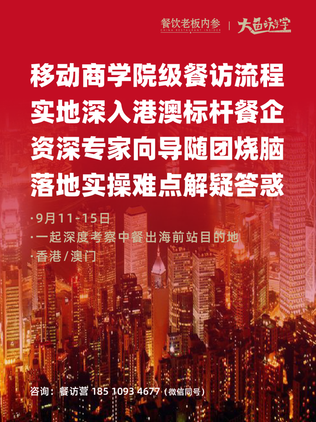 餐访行程亮点:全程移动商学院级餐访流程、实地深入港澳标杆餐企、亲身体验港澳生态环境、近距洞察港澳消费需求、行业专家/向导嘉宾随团烧脑交流、落地难点解惑答疑。