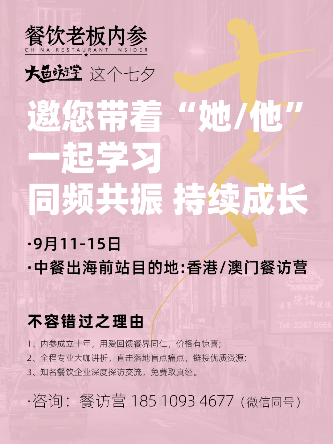 9月13日上午、15日下午,将围绕香港、澳门举行两场闭门私董会,会内有香港餐饮协会、餐饮品牌、餐饮老板内参等多方代表,共同把脉两岸餐饮发展,激情对谈,观点碰撞!