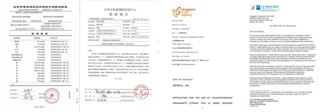 别看这个“小家伙”直径只有10微米(0.01毫米),只有在显微镜下才能看得到,它可是经过了中国卫健委审批通过的,高营养价值的新食品原料。通过了包括FDA的GRAS在内的多个国内外权威检测机构的安全认证。(注:GRAS 是美国 FDA 评价食品添加剂的安全性指标,是国际公认的检测机构)莱茵衣藻也经过了多家海内外权威检测机构数据显示,其中蛋白质、衣藻粗多糖、膳食纤维、维生素和微量元素等成分表现优异。