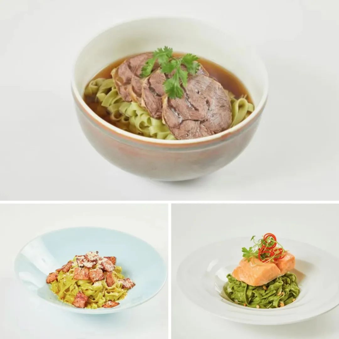 关于这种藻类的新品,港丽一口气上新了一整个系列:有酱香浓郁汤色清亮的中式牛肉面、有配上低温烘煮的三文鱼西式藻面、还有颇具东南亚风味的新品。