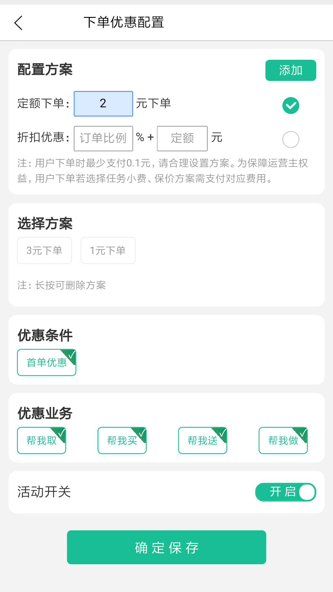 —— 2021.08.20—— 开学季!冲 安菲校园跑腿系统 铁汁们,不知不觉已经八月中旬。还有半个月不到的时间,我们即将看到这样一幅场景:新生大批涌入校园,老生也从悠闲的暑假回归到学习当中去。 作为校园跑腿运营主,首要目的肯定是跑腿项目能够获得令自己满意的收入,所以一定不能错过开学季这个机会。 古人云:知己知彼,百战不殆。要想运营好跑腿项目,打响开学第一枪,前期的准备工作就不能少。 目录 1 资金投入 2 宣传推广 3 业务拓展 4 团队管理 [机会只留给有准备的人] Opportunity comes to those who are prepared 资金投入 老话说:有舍才有得。这句话对跑腿项目也适用。跑腿项目虽然投入低,但也遵循有投入才有回报的原则。接下来我们就来看看在跑腿项目开学准备中,需要哪些投入! 团队服装 1.重要性 统一的团队服装就像是跑腿项目的“脸”,用户可以从这张脸上看到接单员的专业素养和信任。不仅如此,它还可以加深用户对跑腿的印象,通过服饰让用户自然联想到跑腿项目。所以,作为一个想赚钱的跑腿运营主,这笔开支必不可少。 2.购买方式 可以从拼夕夕上入手,便宜又实惠。联系客服定制logo,重要突出团队的专业素养与形象。如果团队人数太多,也可用帽子,徽章等代替。 传单海报 1.传单海报是推广跑腿项目的“利器”,能让对此项目有兴趣的用户直观感受到跑腿的优势,吸引他们的眼球,所以这笔投入也是非常必要的。 2.【校园跑腿系统】免费提供传单海报的电子版,运营主只需要保存后打印即可。 下单优惠 开学季,运营主可以开展下单优惠活动,在刺激用户下单的同时,也宣传了跑腿项目。 系统操作流程为:【校园跑腿系统】——【系统配置】——【营销活动】——【下单优惠/优惠券】 宣传推广 宣传推广的重要性这里就不再赘述,主要讲有哪些主要推广方式。 摆点推广 既然是开学季,运营主则可以在校园内摆放一个固定站点,专门为新生讲解各种问题。同时也可以选择举办送小礼物的推广活动,新生用户扫描二维码,关注自己的校园跑腿系统,即可获得一份小礼物。 寝室推广 这种方式效果非常好,因为能够直接给用户讲解,指导操作,再配合寝室贴,当用户需要跑腿时,扫码即可下单。 传单推广 在校门口、商铺旁等人群流动性大的地方进行派发,缺点是比较耗传单,资金紧缺可以派发少量作为一种辅助推广。 社群推广 可以通过微信群、QQ群、校园论坛等方式推广,基本不花费资金。 注意事项 运营主在推广跑腿项目的时候,一定要知道,我们的目的不仅仅是让用户来下单,同时也可以让其成为接单员,拓展跑腿项目。 业务拓展 新生入校跑腿迎来庞大的用户群体,运营主要抓住入校的机会拓展跑腿业务。 商家合作 1.打印店 新生入校后需要复印大量的文件、资料,运营主则可以与打印商家合作,用户向商家上传打印文件后,接单员进行派送,为学生群体解决排队、路远等痛点。 2.校外餐馆 运营主与校外餐馆合作,将店铺贴贴在餐馆,在外卖行业竞争严重的环境下,跑腿项目能够给商家带来销售量以及关注度,商家不会拒绝。 3.生活物品 新生入校需要购置大量生活物品,比如床上用品、洗漱用品等等,运营主可根据学校具体情况适当进行业务重心转移,代买,代送,不一定非要以盈利为主,跑腿项目能在开学期间获得曝光度就是赚。 工具更新 业务拓展自然会带来工具上的一些更新,比如上面提到的摆点推广,那么伞棚,音响之类的设施就可以适当配备;在配送大量物品时,一些配送工具如自行车、三轮车、背包、拖箱等工具也要准备齐全。 业务节点 如同此时的开学季,学生大量涌入校园。之后新生的军训也是跑腿项目蓬勃发展的好时机。军训所需要的防晒用品、饮品、水果、志愿者运营主都可以适当提供,也可举办新生联谊活动,让新生带动全校学生的“跑腿热”,促进跑腿项目的发展。 团队管理 古语云:“工欲善其事,必先利其器”。这个“器”在校园跑腿项目中就是就是团队。 成员招募 1.优先选择身边的朋友、熟悉的同学。 2.可以通过成员内推、校园群、表白墙、商家贴、招聘广告、地推等方式招募。 成员分配 1.跑腿项目中可以没有临时接单员,但一定要有固定接单员。 2.招选接单员后,将不同时间段的接单员整理出来。根据工作时段和成员匹配程度,合理更迭配送成员,避免人员上的浪费。 4.如需签订接单员和用户的服务协议,运营主可通过【校园跑腿系统】——【成员】——【服务协议】进行签订。 薪资福利 1.接单员的薪资可以是日、周、月结等,但一定要按时发放。 2.设置生日福利、节日福利、定期聚餐等等都可以提高配送员积极性,增加团队粘性。 3.可以在系统中设置接单员奖励制度,对订房未超时、未释放订单、用户好评的优质接单员进行奖励。 4.福利、激励等活动,都是为了增强团队凝聚力,调动接单积极性,运营主一定要明白这个道理。 配送要求 接单员在配送时的服务态度之前的文章已经讲过,这里需要讲的是当前疫情并为完全结束,在接单时要注意疫情的防控。 1.无接触配送:接单员与用户约定物品接收地点和时间,接单员将物品放在该位置,用户自取即可,这样能保障用户与接单员的安全。 2.接单员配送完成时一定要用消毒酒精对衣物、双手进行消毒。 3.配送要求运营主可以通过接单群或系统【团队公告】,告知配送规则。 长