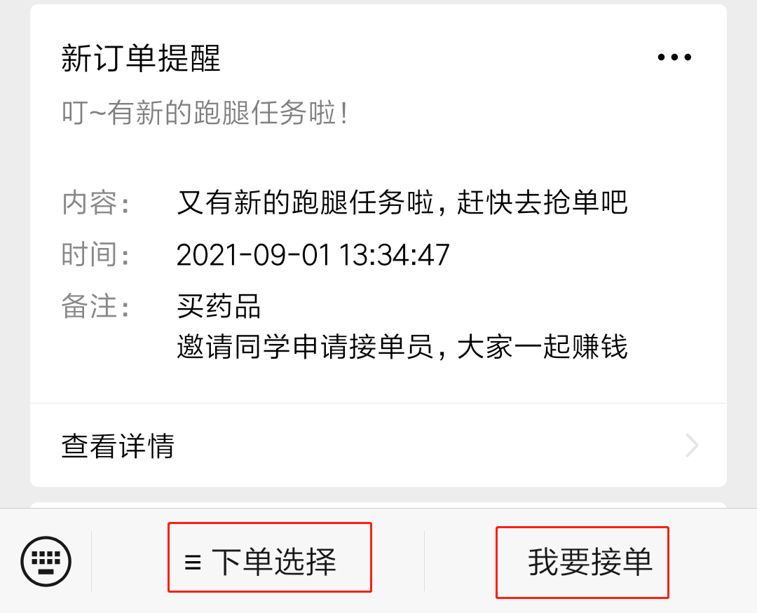 3.用户下单后,订单自动发往【校跑团】公众号,接单员接单后根据订单信息完成配送,输入用户的订单【完成码】即可。