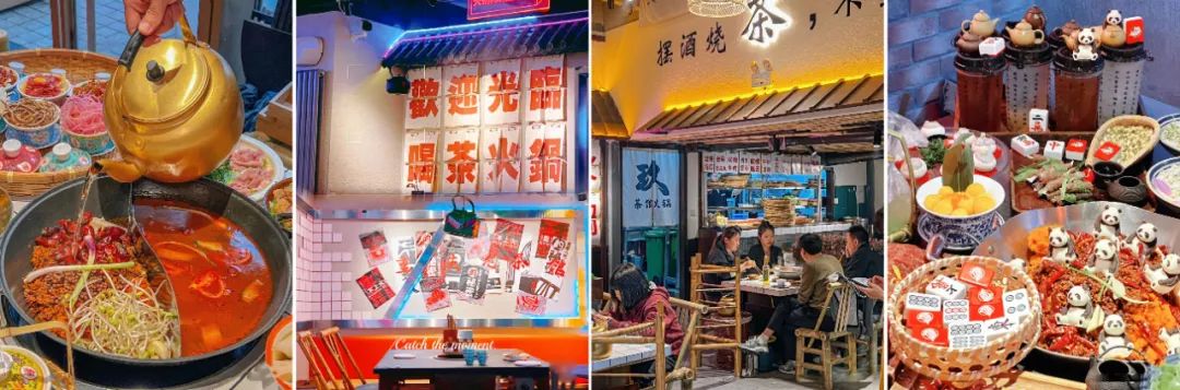 比如,较早之前,邓姓影视明星,做了个“壶·茶火锅”,用茶系火锅掀起一轮创新热潮。门店的设计“很重庆”,一进门就是一整面暖壶和茶叶罐,小料台也用茶杯当容器,十分上镜。底料用茶炒,火锅汤底用的也是茶,麻辣鲜香的同时还会回甘,号称“重庆人吃火锅不上火的秘密”。