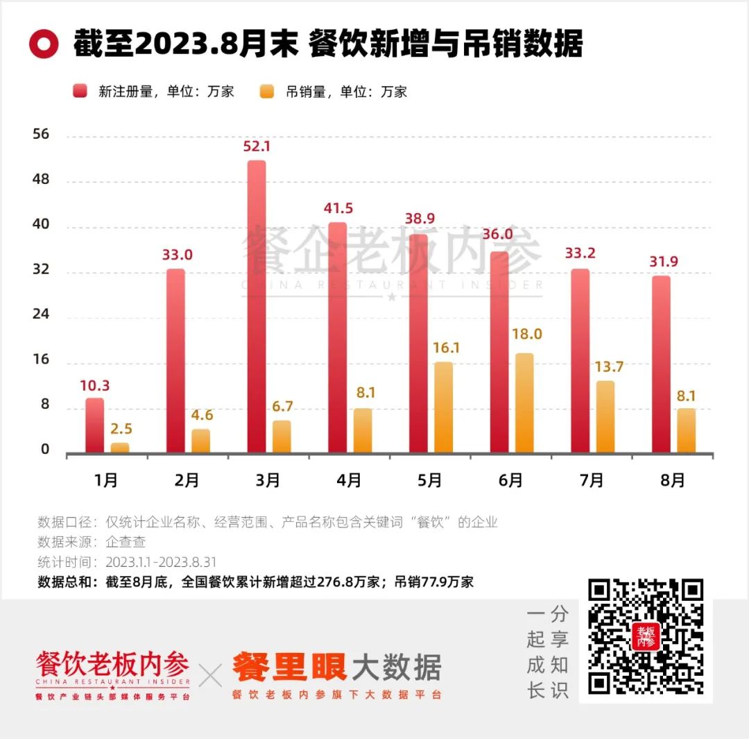 可就在这两个月,企查查数据显示,餐饮新增数据还在飙升:7、8两个月,餐饮新注册65.1万家,截至8月底,全国餐饮累计新增超过276.8万家!