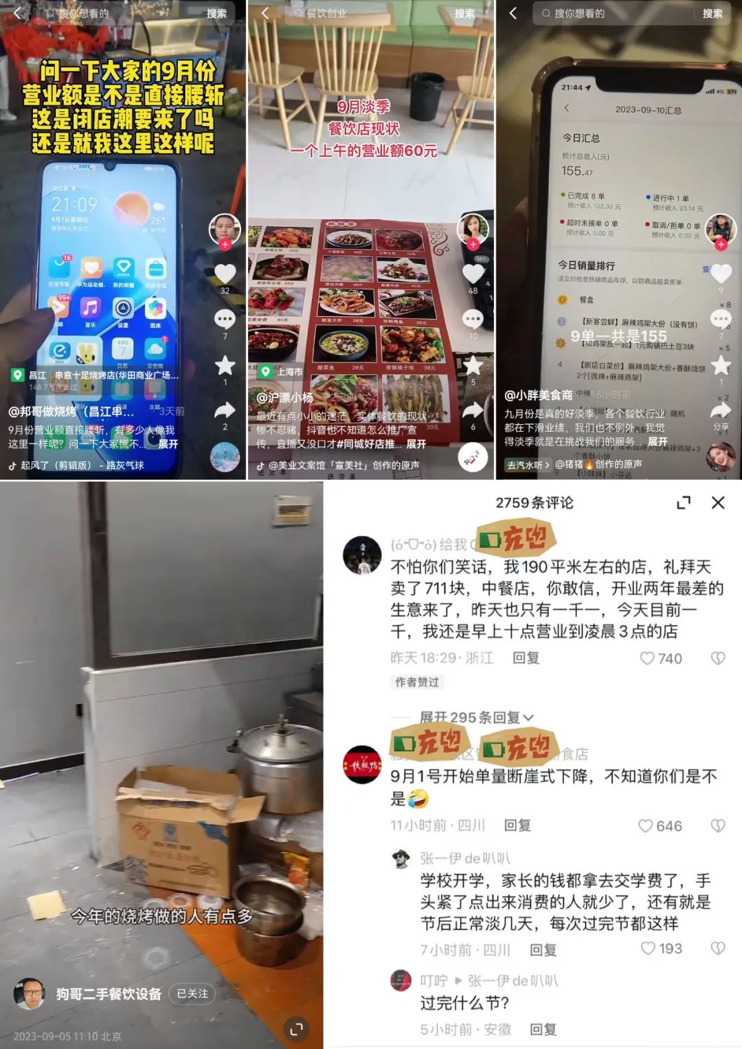 有人称之为“灰色9月”,并晒出了9月份的营业数据:“我们接近200平米的中餐店,礼拜天卖了700块钱,开业两年最差的生意来了,这几天持续是1000元左右,这是从早上10点到凌晨3点的数据!”“9月1日起单量开启断崖式下跌,不知道你们是不是?”“暑假一天2千多,这个月周末两天都干不到2千更别提平日了……”