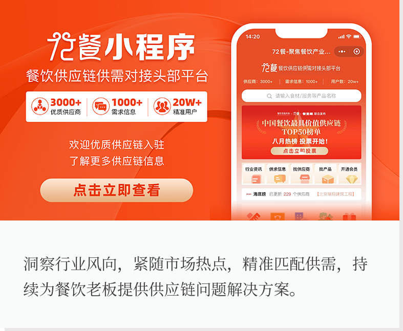 72餐汇集上千家餐饮供应链和服务商企业,涵盖超万款优质供应链产品及产业链服务商,为餐饮老板搭建优质的服务合作对接平台。