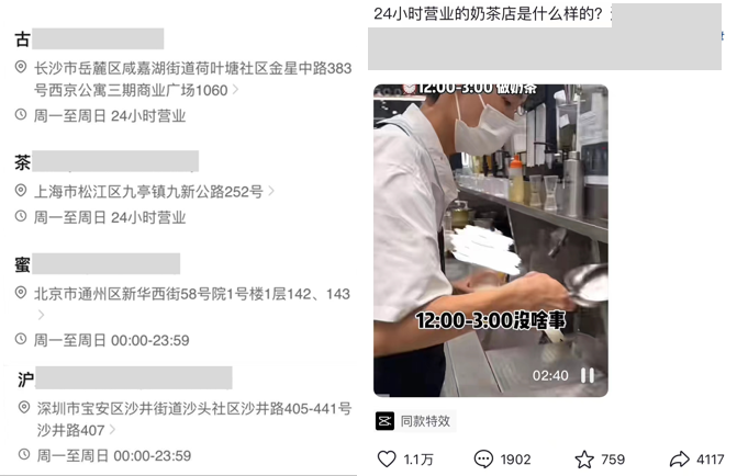 一、二线城市的部分奶茶店,不仅营业至凌晨,有些甚至已经转向24小时不打烊。
