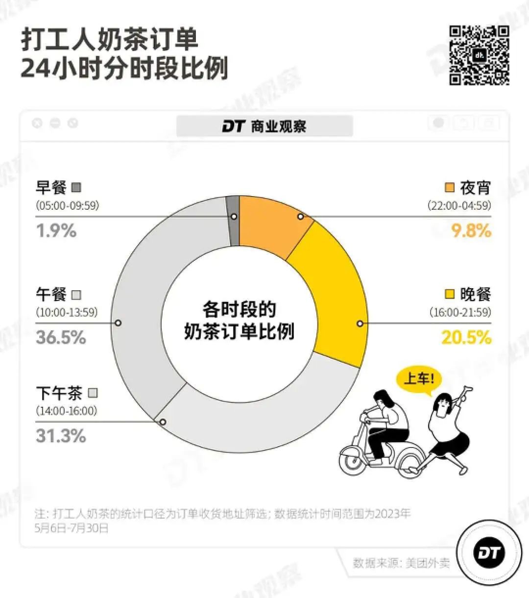 那么,谁是深夜的奶茶消费者?除了过“夜生活”玩家外,还有不少“打工人”用来续命。美团数据显示,夜间时段(22:00-4:59)打工人在写字楼或园区所下的订单占比为9.8%,远远高于占比1.9%的早餐时段。
